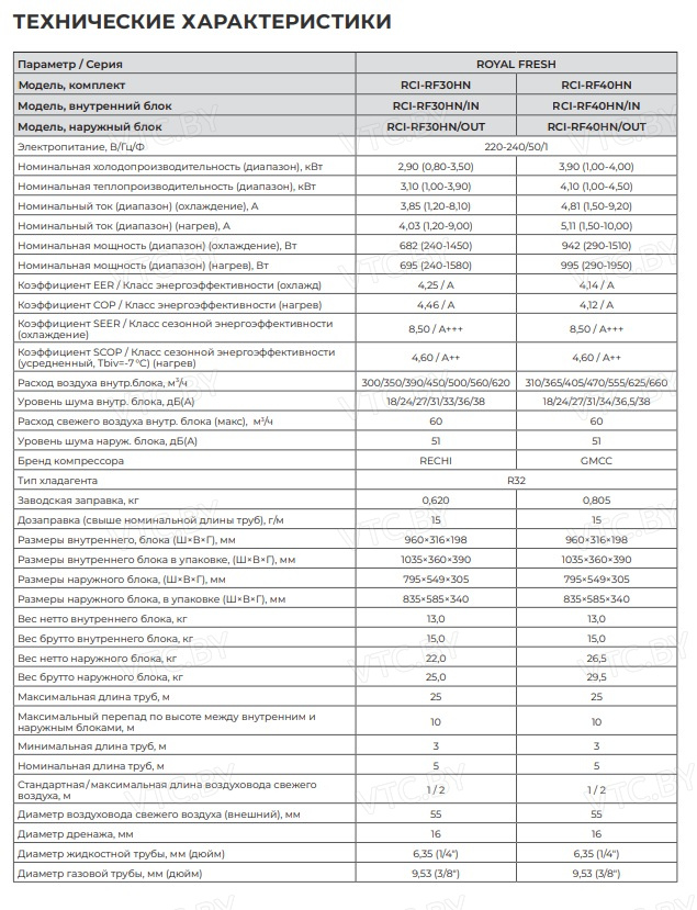 Бренд Royal Clima Модель Royal Fresh Full DC EU Inverter RCI-RF40HN Завод изготовитель TCL Air Conditioner (Zhongshan) Co., Ltd Тип кондиционера Сплит-система Тип внутреннего блока Настенный Производительность по воздуху, м³/ч 660 Инверторная технология Да Обслуживаемая площадь м2 40 Цвет внутреннего блока Белый (глянцевый) Приток свежего воздуха Да Хладагент R-32 Wi-Fi Есть Режим работы при обогреве -20 Мощность охлаждения, кВт 3.9 Мощность обогрева,кВт 4.1 Особенности Таймер, Угольный фильтр, HEPA фильтр, Ультрафиолетовая лампа , Авторестарт после пропадания питания, iFeel (датчик температуры в пульте д/у), Антибактериальная защита, Регулировка направления, Регулировка скорости, Режим ЭКО ( ECO ), Режим антизамерзания, Режим обогрева, Режим разморозки, Система самодиагностики неисправности, Супер тихий, Фильтр предварительной очистки , Фильтр с ионами серебра Гарантия(месяцев) 12 Шум внутреннего блока,дБ 18 Шум наружного блока,дБ 51 Ширина внутреннего блока,см 96 Высота внутреннего блока,см 31.6 Глубина внутреннего блока,см 19.8 Ширина наружного блока,см 79.5 Высота наружного блока,см 54.9 Глубина наружного блока,см 30.5 Интеграция в умный дом Фирменное приложение, Яндекс. Алиса Потребляемая мощность, кВт (при обогреве) 0.995 Потребляемая мощность, кВт (при охлаждении) 0.942 Диаметр жидкостной магистрали 1/4 Диаметр газовой магистрали 3/8 Класс энергоэффективности при обогреве A+++ Класс энергоэффективности при охлаждении A+++ -