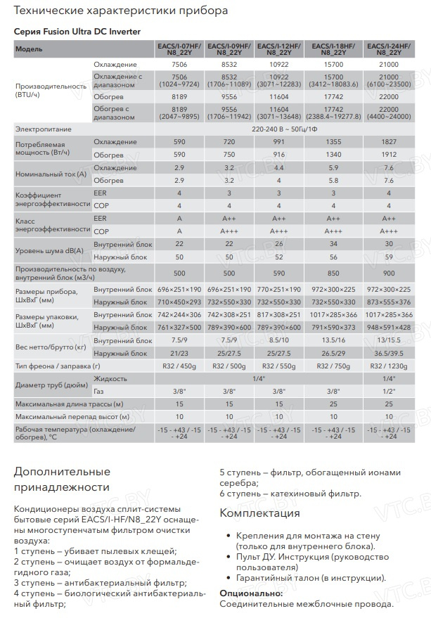 Бренд Electrolux Модель Fusion Ultra DC Inverter EACS/I-24HF/N8_22Y Завод изготовитель Gree Electric Appliances Inc. of Zhuhai Тип кондиционера Сплит-система Тип внутреннего блока Настенный Производительность по воздуху, м³/ч 900 Инверторная технология Да Обслуживаемая площадь м2 45 Цвет внутреннего блока Белый (глянцевый) Хладагент R-32 Wi-Fi Опция Режим работы при обогреве -15 Мощность охлаждения, кВт 6.15 Мощность обогрева,кВт 6.45 Особенности Таймер, Биофильтр, Ионизация, Пылевой фильтр, Авторестарт после пропадания питания, iFeel (датчик температуры в пульте д/у), Антибактериальная защита, Регулировка направления, Регулировка скорости, Режим ЭКО ( ECO ), Режим обогрева, Режим разморозки, Система самодиагностики неисправности, Фильтр предварительной очистки , Фильтр с ионами серебра Гарантия(месяцев) 60 Шум внутреннего блока,дБ 34 Шум наружного блока,дБ 59 Ширина внутреннего блока,см 97.2 Высота внутреннего блока,см 30 Глубина внутреннего блока,см 22.5 Ширина наружного блока,см 87.3 Высота наружного блока,см 55.5 Глубина наружного блока,см 37.6 Потребляемая мощность, кВт (при обогреве) 1.912 Потребляемая мощность, кВт (при охлаждении) 1.827 Диаметр жидкостной магистрали 1/4 Диаметр газовой магистрали 1/2 Класс энергоэффективности при обогреве A++ Класс энергоэффективности при охлаждении A+++ - Отзывы