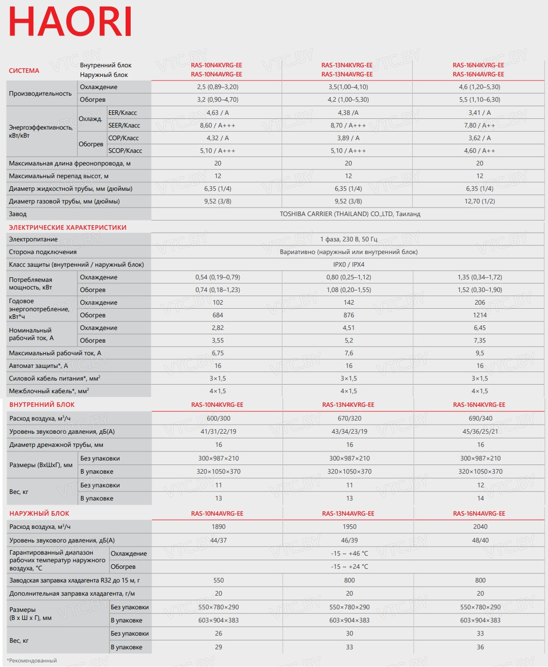 Бренд Toshiba Модель Haori RAS-13N4KVRG-EE/RAS-13N4AVRG-EE Тип кондиционера Сплит-система Тип внутреннего блока Настенный Производительность по воздуху, м³/ч 670 Инверторная технология Да Обслуживаемая площадь м2 35 Хладагент R-32 Wi-Fi Есть Режим работы при обогреве -15 Мощность охлаждения, кВт 3.5 Мощность обогрева,кВт 4.2 Особенности Таймер, Ионизация, Плазменный фильтр, Авторестарт после пропадания питания, Антибактериальная защита, Регулировка направления, Регулировка скорости, Режим ЭКО ( ECO ), Режим антизамерзания, Режим обогрева, Режим разморозки, Система самодиагностики неисправности, Супер тихий, Фильтр предварительной очистки Гарантия(месяцев) 60 Шум внутреннего блока,дБ 19 Шум наружного блока,дБ 46 Ширина внутреннего блока,см 98.7 Высота внутреннего блока,см 30 Глубина внутреннего блока,см 21 Ширина наружного блока,см 78 Высота наружного блока,см 55 Глубина наружного блока,см 29 Интеграция в умный дом Фирменное приложение, Яндекс. Алиса Потребляемая мощность, кВт (при обогреве) 1.08 Потребляемая мощность, кВт (при охлаждении) 0.8 Диаметр жидкостной магистрали 1/4 Диаметр газовой магистрали 3/8 Класс энергоэффективности при обогреве A+++ Класс энергоэффективности при охлаждении A+++ - Отзывы