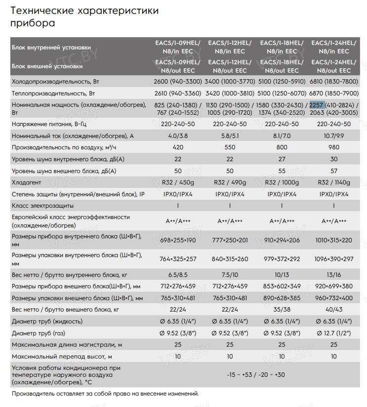 Бренд Electrolux Модель HEL DC Inverter EACS/I-12HEL/N8 EEC Завод изготовитель TCL Air Conditioner (Zhongshan) Co., Ltd Тип кондиционера Сплит-система Тип внутреннего блока Настенный Производительность по воздуху, м³/ч 550 Инверторная технология Да Обслуживаемая площадь м2 35 Цвет внутреннего блока Белый (глянцевый) Хладагент R-32 Wi-Fi Опция Режим работы при обогреве -20 Мощность охлаждения, кВт 3.4 Мощность обогрева,кВт 3.42 Особенности Таймер, Угольный фильтр, Фотокаталитический фильтр , Авторестарт после пропадания питания, Бесконтактное включение, Воздушный фильтр, Регулировка направления, Регулировка скорости, Режим обогрева, Фильтр с ионами серебра Гарантия(месяцев) 60 Шум внутреннего блока,дБ 22 Шум наружного блока,дБ 50 Ширина внутреннего блока,см 77.7 Высота внутреннего блока,см 25 Глубина внутреннего блока,см 20.1 Ширина наружного блока,см 71.2 Высота наружного блока,см 45.9 Глубина наружного блока,см 27.6 Потребляемая мощность, кВт (при обогреве) 1.005 Потребляемая мощность, кВт (при охлаждении) 1.13 Диаметр жидкостной магистрали 1/4 Диаметр газовой магистрали 3/8 Класс энергоэффективности при обогреве A++ Класс энергоэффективности при охлаждении A+++ - Отзывы