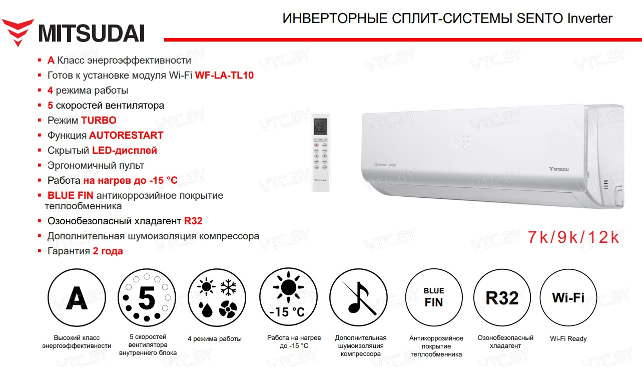 Mitsudai Sento Inverter — это современная инверторная сплит-система, обеспечивающая высокую энергоэффективность и комфорт в любое время года. Она оснащена антикоррозийным покрытием теплообменника Blue Fin, что продлевает срок службы даже в сложных условиях. Кондиционер работает на озонобезопасном хладагенте R32 и поддерживает нагрев при температуре до -15°C. Благодаря низкому уровню шума (от 24 дБ) и возможности подключения Wi-Fi модуля, управление становится максимально удобным. Гарантия производителя составляет 2 года, что подтверждает надежность устройства.
