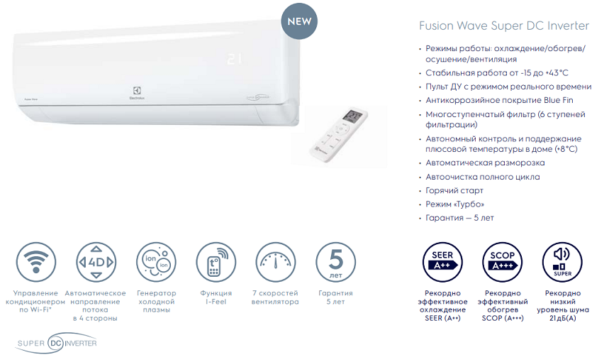 Electrolux Fusion Wave Super DC EACS/I-18HFW/N8 — это высокопроизводительная инверторная сплит-система для больших помещений. Модель обеспечивает мощное и быстрое охлаждение и обогрев, демонстрируя при этом высочайшую энергоэффективность класса А++. Многоступенчатая система фильтрации в сочетании с ионизацией Cold Plasma создает комплексную защиту от загрязнений, аллергенов и бактерий. Высокая производительность по воздуху гарантирует равномерное и быстрое распределение температуры по всему объему комнаты. Интеллектуальная функция i-Feel обеспечивает точный климатический контроль именно в той зоне, где находится пользователь. Широкий рабочий диапазон температур делает эту модель надежным решением для круглогодичного использования.