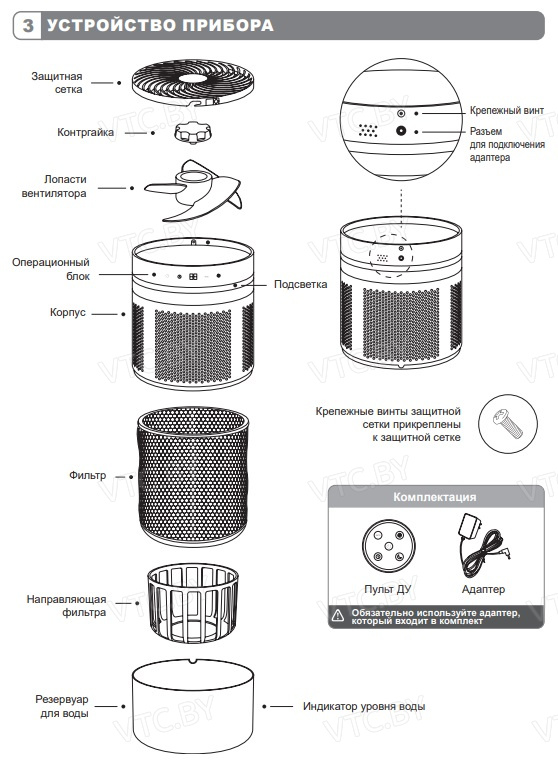 - Защита от работы с пустым баком – прибор продолжает работу как очиститель воздуха даже при отсутствии воды.