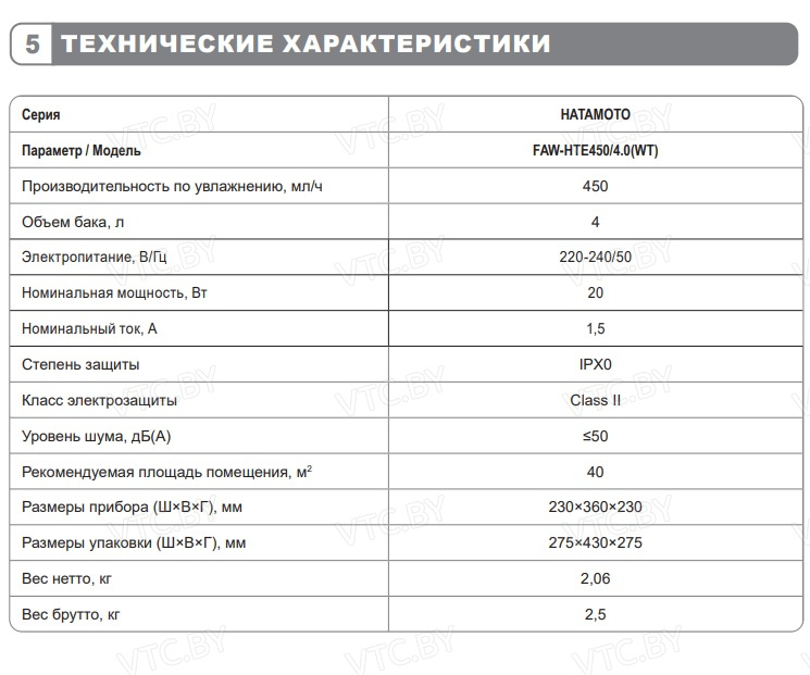 - Производительность увлажнения 450 мл/ч – эффективно поддерживает влажность в помещениях до 40 м².