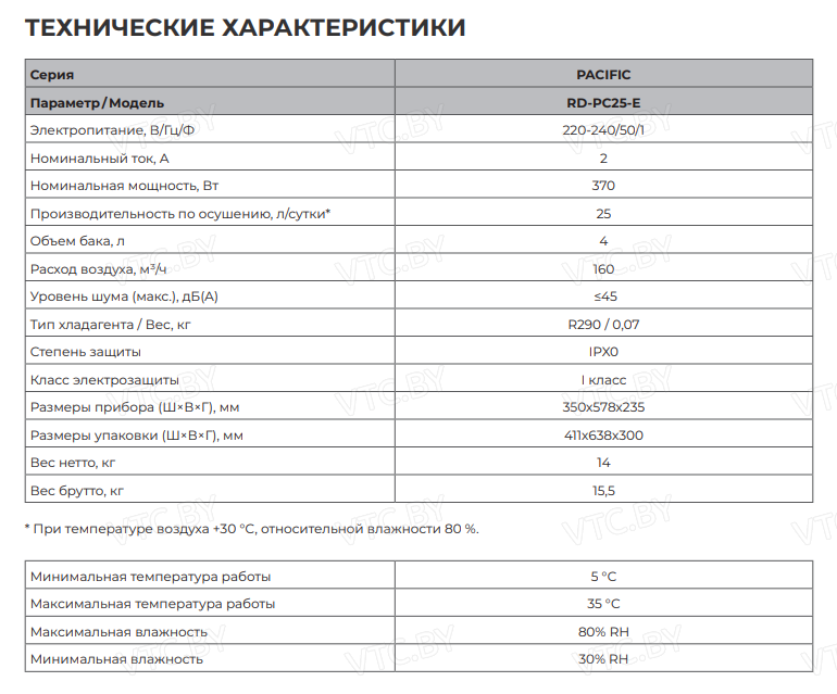 Бренд Royal Clima Модель Pacific Loft RD-PC25-E Производительность,л/сут 25 Производительность по воздуху, м³/ч 160 Объем резервуара,л 4 Обслуживаемая площадь м2 36 Гигрометр Да Гигростат Да Управление Электронное Уровень шума,дБ 45 Потребляемая мощность, кВт 0.37 Особенности Таймер, Воздушный фильтр, Индикатор наполнения, Регулировка скорости, Режим антизамерзания, Режим разморозки, Система самодиагностики неисправности Гарантия(месяцев) 12 Высота см. 57.8 Ширина см. 35 Глубина см. 23.5 Область приминения Бытовой Отвод конденсата Резервуар Принцип работы Конденсационный -