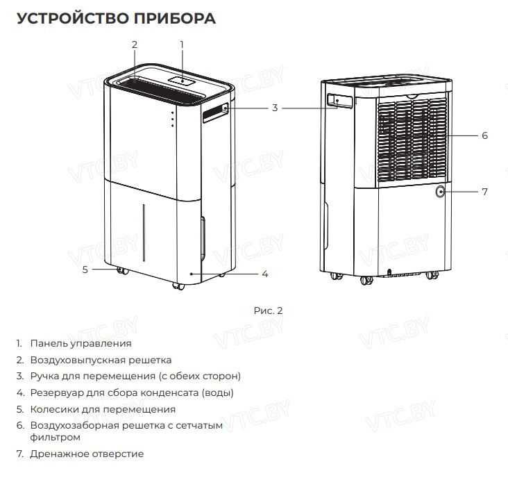 - Две скорости вентилятора — позволяют выбрать баланс между скоростью осушения и уровнем шума.