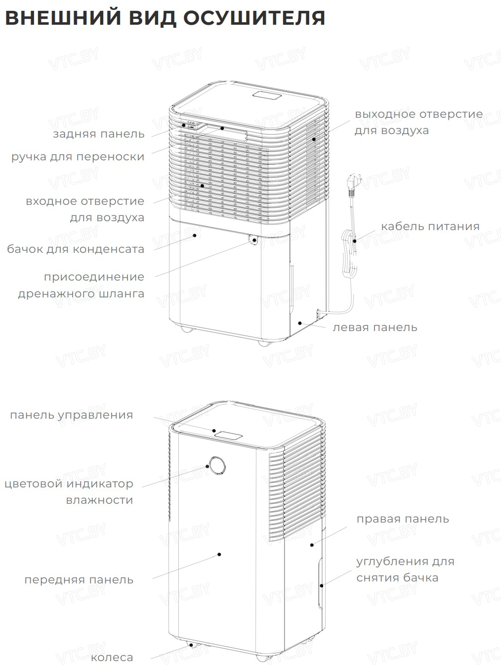 - Мобильность — компактные размеры, колесики и ручка позволяют легко перемещать осушитель.