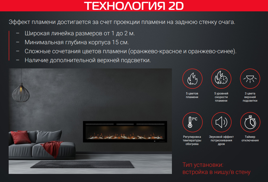 - Широкая панель (2032 мм) — создает масштабный и захватывающий визуальный эффект пламени.