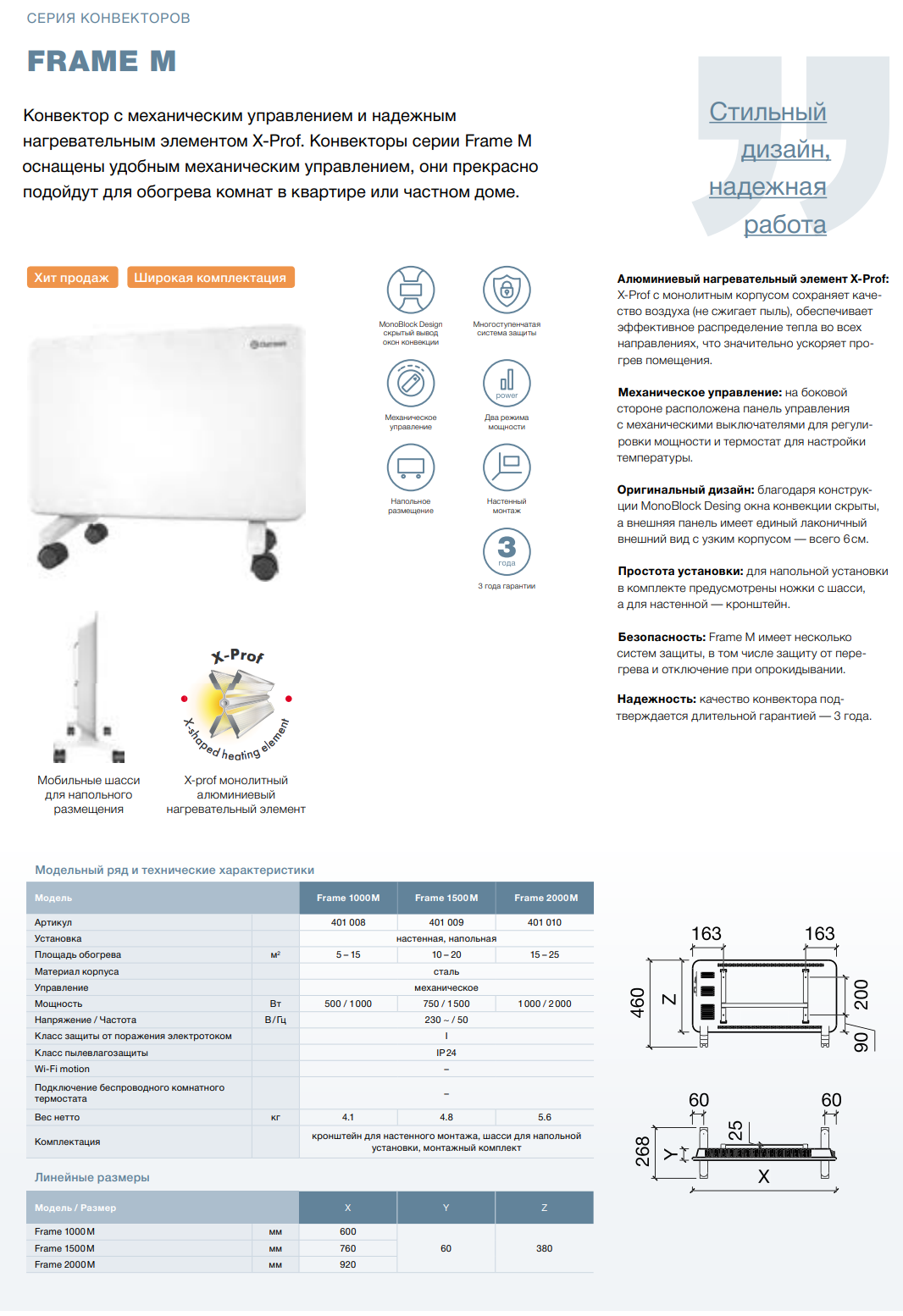 Бренд Thermex Модель Frame 1000M Тип Конвектор Мощность кВт 1.0 Регулировка уровня мощности, кВт 0.5, 1.0 Обслуживаемая площадь м2 15 Вид установки (крепления) Напольный, Настенный Управление Механическое Особенности Влагозащитный корпус, Защита от перегрева, Механический термостат, Регулировка уровня мощности Напряжение 220 В Гарантия(месяцев) 12 Высота см. 38 Ширина см. 60 Глубина см. 9 Тип нагревательного элемента Монолитный Цвет Белый - Отзывы
