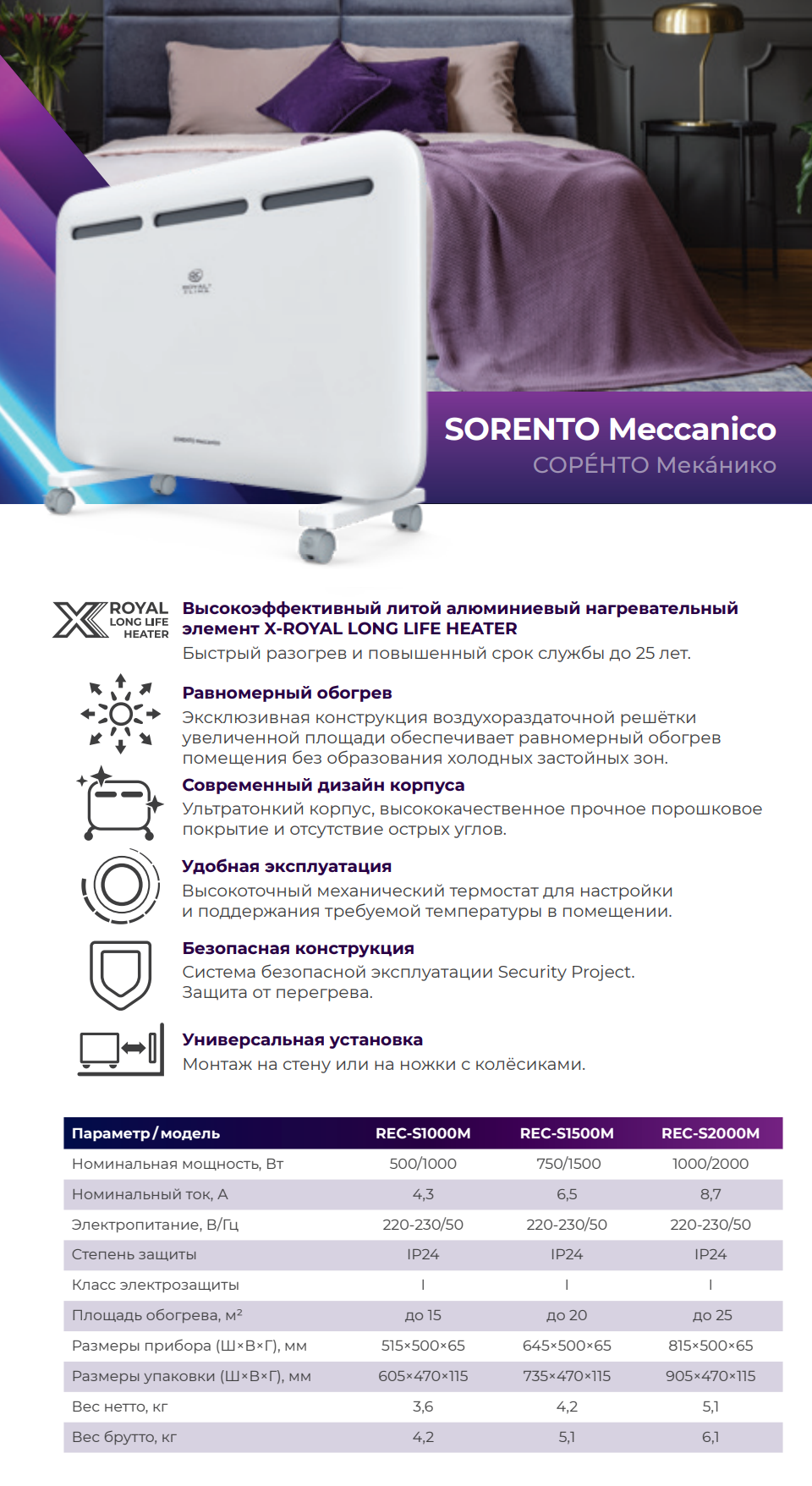 Конвектор Royal Clima Sorento Meccanico REC-S1000M — это компактный и стильный источник комфортного тепла для небольших помещений площадью до 10-15 м². Его ультратонкий корпус толщиной всего 6,5 см с плавными формами гармонично впишется в любой современный интерьер. В основе прибора лежит уникальный алюминиевый нагревательный элемент X-Royal Long Life Heater, который обеспечивает быстрый и равномерный обогрев, не суша воздух и не сжигая кислород. Управление максимально простое благодаря механическому термостату, а универсальная установка на стену или на пол делает этот конвектор невероятно гибким в использовании.