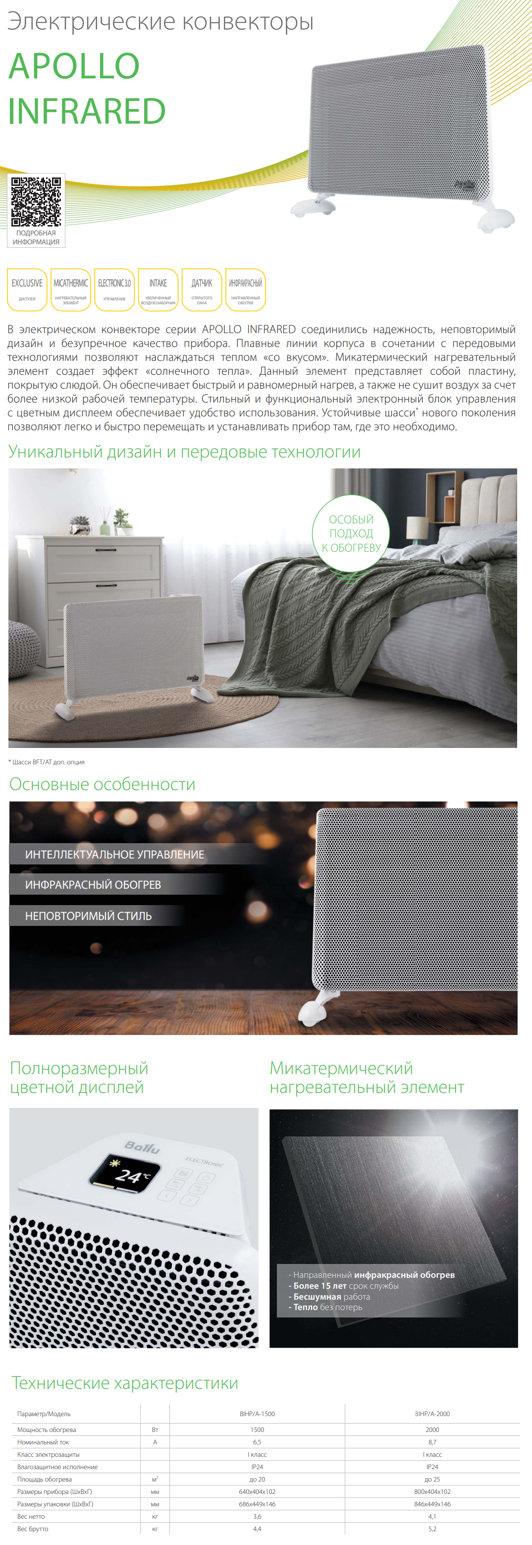 Конвективно-инфракрасный обогреватель Ballu Apollo Infrared BIHP/A-1500 сочетает в себе инновационные технологии обогрева и элегантный дизайн. Микатермический нагревательный элемент создает эффект естественного солнечного тепла, обеспечивая мгновенный комфорт. Электронная система управления с цветным TFT-дисплеем позволяет точно контролировать все параметры работы прибора. Технология Dual Heat сочетает инфракрасный обогрев поверхностей и конвекционный прогрев воздуха для максимальной эффективности. Универсальная конструкция с возможностью настенного и напольного монтажа делает обогреватель идеальным для любого интерьера. Влагозащищенное исполнение IP24 расширяет возможности использования прибора в помещениях с повышенной влажностью.