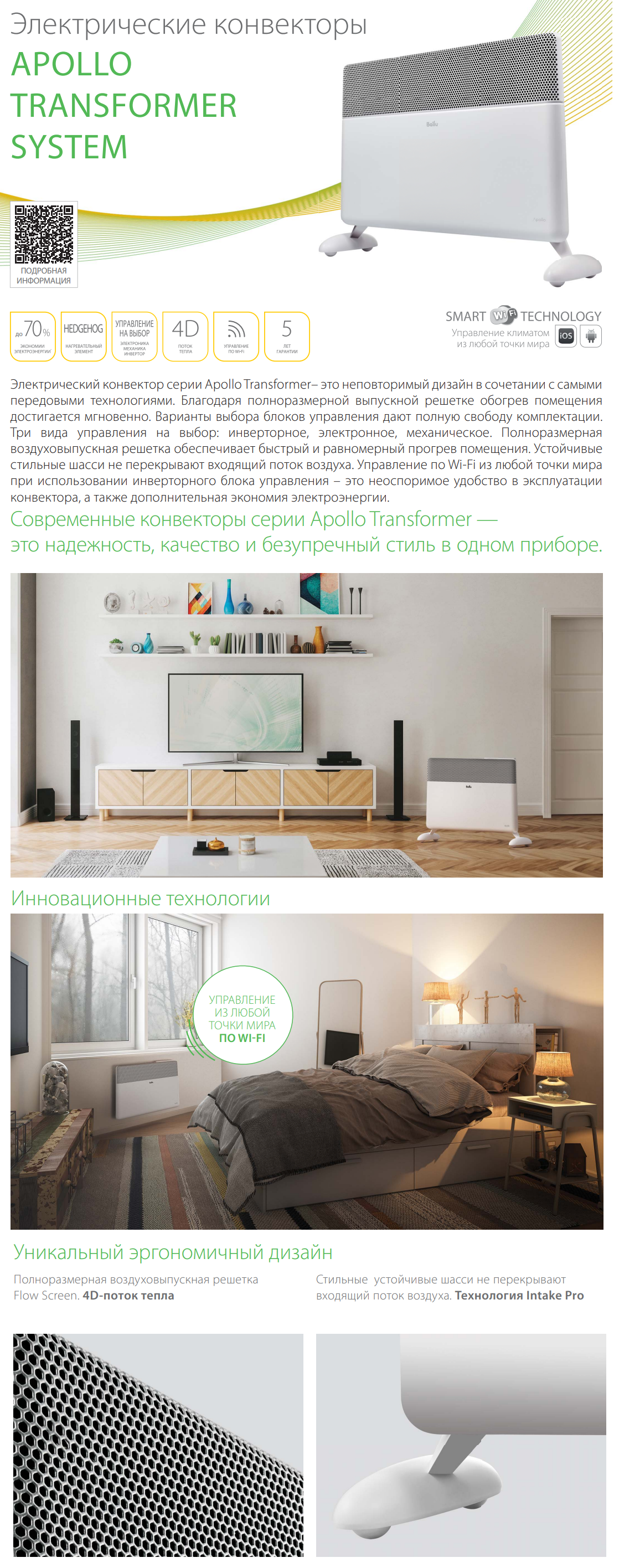 Ballu Apollo Transformer BEC/AT-1500 представляет собой инновационную модульную систему отопления с уникальным подходом к комплектации. Базовый отопительный модуль оснащен запатентованным нагревательным элементом HEDGEHOG, обеспечивающим нагрев на 20% быстрее аналогов. Особенностью серии является возможность самостоятельного выбора комплектующих: ножки для напольной установки и блок управления приобретаются отдельно согласно вашим потребностям. Вы можете выбрать один из трех типов управления - от простого механического до продвинутого инверторного с Wi-Fi и экономией до 70%. Технология 4D потока тепла и полноразмерная решетка Flow Screen гарантируют равномерный прогрев всего помещения. Влагозащищенное исполнение IP24 позволяет безопасно использовать конвектор в ванных комнатах и других помещениях с повышенной влажностью.