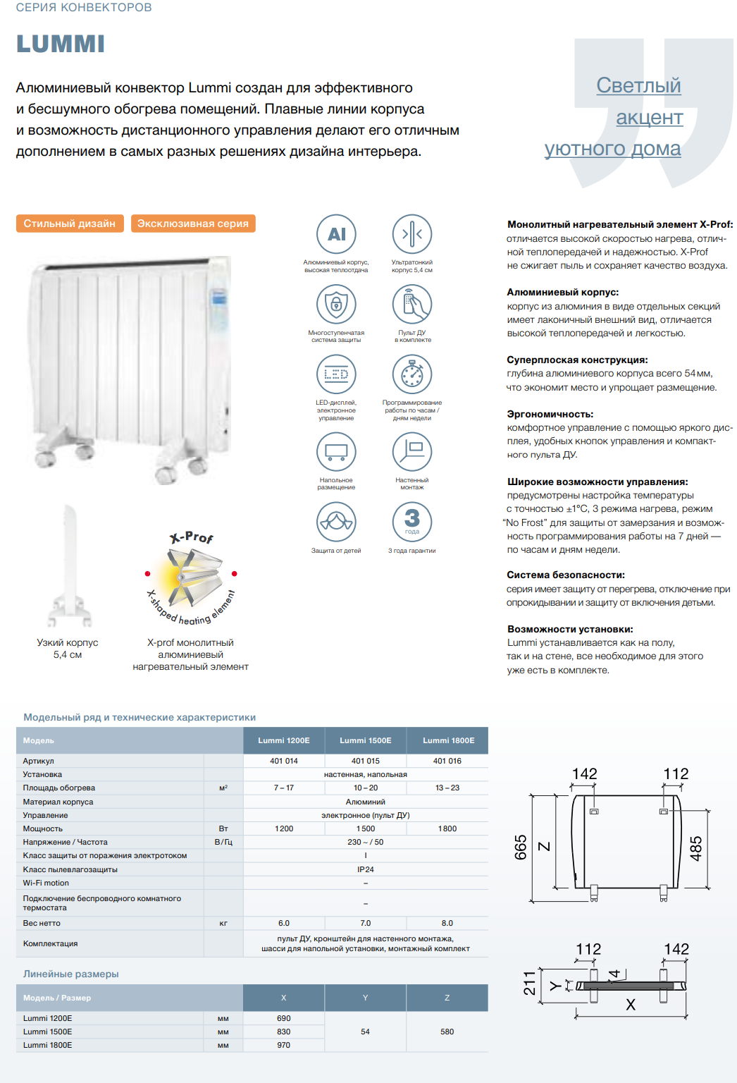 Конвектор Thermex Lummi 1200E — это компактное и стильное вертикальное решение для точного и энергоэффективного обогрева. Он сочетает в себе современный электронный блок управления с пультом ДУ, функцию недельного программирования и ультратонкий профиль, что делает его одновременно мощным помощником и элегантным элементом интерьера. Естественная конвекция и встроенные системы защиты обеспечивают комфортный, безопасный и бесшумный обогрев, адаптирующийся под ваш ритм жизни.