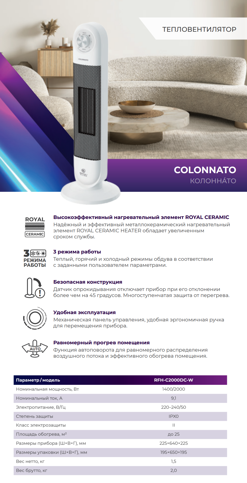 Электрический тепловентилятор Royal Clima Colonnato RFH-C2000DC-WT — это мощное и эффективное решение для быстрого обогрева помещений площадью до 25 м². Его сердцем является современный керамический нагревательный элемент, обеспечивающий быстрый нагрев и повышенную безопасность. Два режима мощности и функция автоматического горизонтального поворота позволяют гибко и равномерно распределять тепло. Компактный элегантный дизайн в итальянском стиле Colonnato делает прибор не только функциональным, но и украшением интерьера. Простое механическое управление гарантирует надежность и интуитивную понятность использования. Благодаря удобной ручке и незначительному весу тепловентилятор легко перемещать туда, где тепло необходимо прямо сейчас.