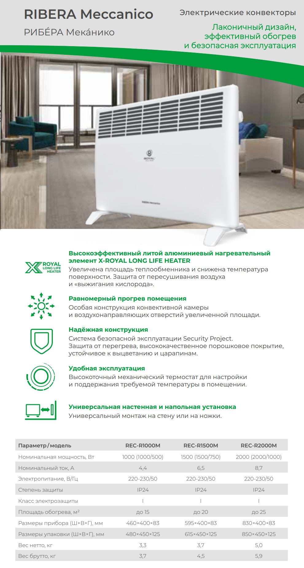 Конвектор Royal Clima Ribera Meccanico REC-R1000M — это элегантное и технологичное решение для эффективного и безопасного обогрева личного пространства. Его ключевой особенностью является инновационный X-образный нагревательный элемент X-ROYAL Long Life Heater, изготовленный из литого алюминия, который обеспечивает мгновенный нагрев, исключительную долговечность и абсолютно бесшумную работу. Ультратонкий корпус глубиной всего 83 мм с современным дизайном органично вписывается в любой интерьер, не загромождая пространство и визуально расширяя комнату. Комплексная система безопасности Security Project включает в себя защиту от перегрева, безопасную температуру лицевой панели и автоматическое отключение при опрокидывании, что делает прибор идеальным для семей с детьми и домашними животными. Функция авторестарта (Restart) автоматически восстанавливает работу конвектора с прежними настройками после внезапного отключения электроэнергии, обеспечивая непрерывный комфорт без вашего участия. Благодаря универсальному способу установки (на стену или на ножки), увеличенному сетевому шнуру и интуитивно понятному механическому управлению, этот конвектор готов к использованию в любой обстановке.