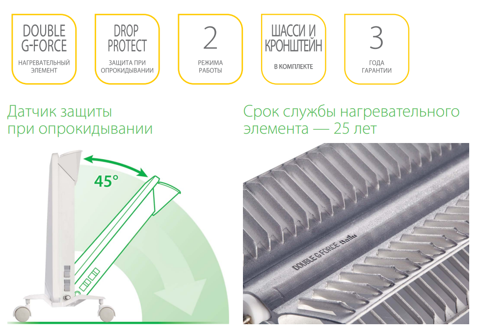 - Монолитный нагревательный элемент Double G Force — обеспечивает высокую теплоотдачу, долговечность и бесшумную работу.
