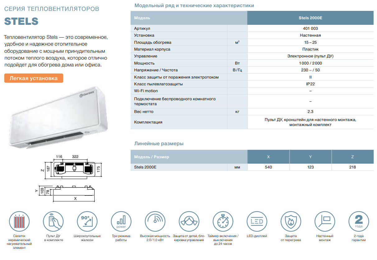 Тепловентилятор Thermex Stels 2000E — это высокоэффективное решение для быстрого принудительного обогрева, сочетающее мощность керамического нагревателя с интеллектуальным управлением. Он предназначен для стационарной настенной установки на высоте, что обеспечивает безопасность и оптимальное распределение теплого воздуха по всему помещению за счет функции автоматических жалюзи. Электронное управление с пульта ДУ, таймер и точная регулировка температуры делают его удобным и современным прибором для создания комфортного климата.
