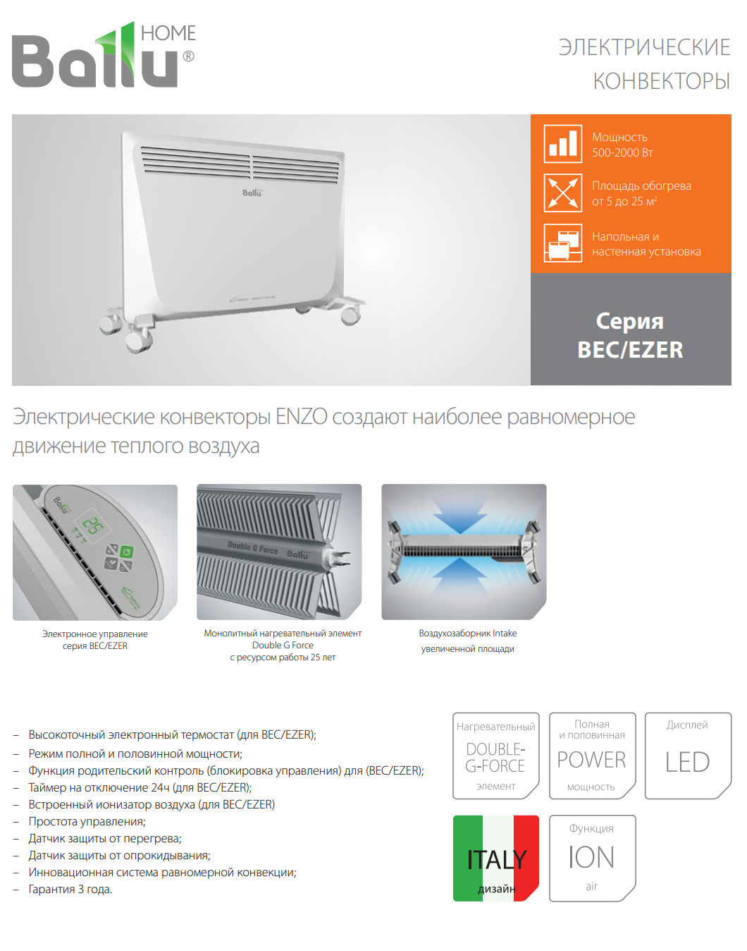 Конвектор Ballu BEC/EZER-1500 — это гармония итальянского дизайна и передовых технологий обогрева, созданная для вашего комфорта. Его выразительный внешний вид, разработанный европейским бюро, делает прибор стильным акцентом в любом интерьере. Высокоточный электронный термостат поддерживает заданную температуру без единого градуса погрешности, обеспечивая значительную экономию электроэнергии. Инновационная система Homogeneous flow и увеличенный воздухозаборник Intake гарантируют быстрый и равномерный прогрев всего помещения без сквозняков. Ваше здоровье и безопасность защищены функцией ионизации ION air, датчиком от перегрева и опрокидывания. Универсальность установки и брызгозащитный корпус IP24 позволяют использовать его практически в любой комнате.