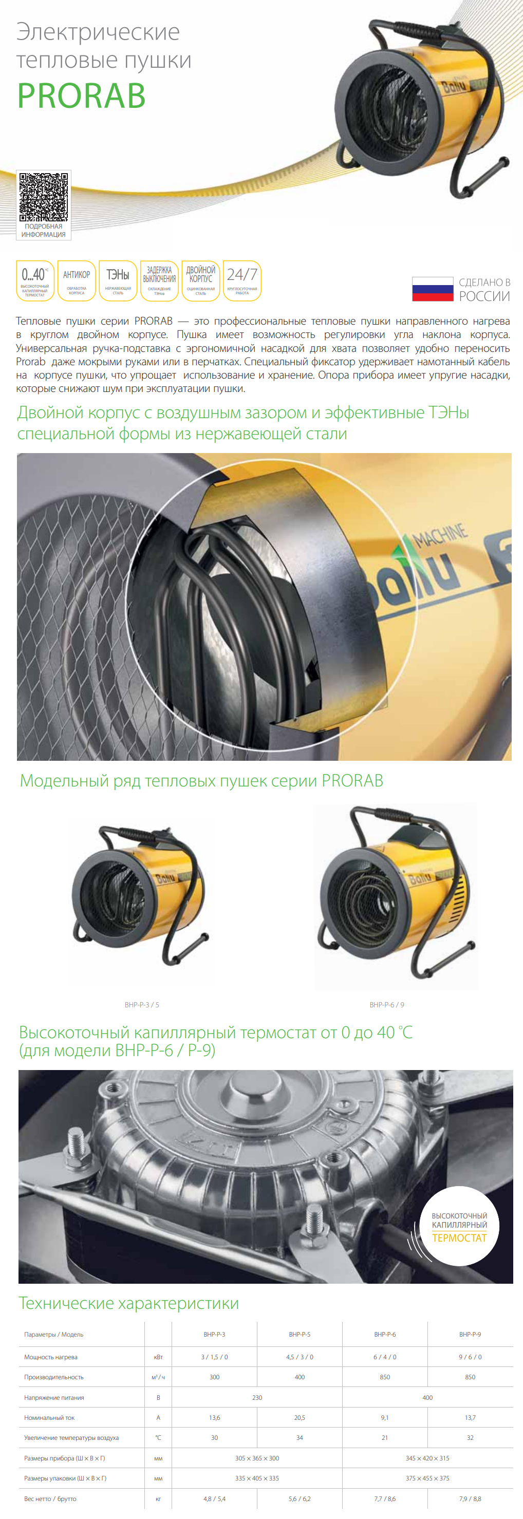 Ballu BHP-P-6 – это мощная трехфазная электрическая тепловая пушка, созданная для профессионального обогрева и просушки больших производственных и складских помещений. Она обладает высокой номинальной мощностью 6 кВт и значительной производительностью по воздуху, что позволяет эффективно работать на площади до 70 квадратных метров. Модель оснащена встроенным механическим термостатом для автоматического поддержания заданной температуры, что отличает ее от младших моделей серии. Усовершенствованная система безопасности включает не только защиту от перегрева, но и функцию автоматической задержки выключения вентилятора для охлаждения нагревательных элементов. Поворотный корпус обеспечивает точное направление мощного теплового потока в нужную зону.