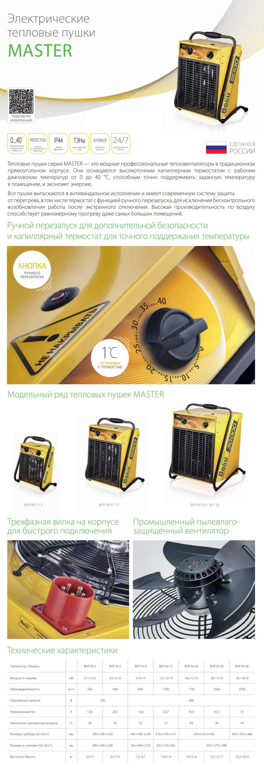 Тепловая пушка Ballu BHP-M-9 — это мощный профессиональный электронагреватель, предназначенный для интенсивного обогрева больших площадей. Её ключевым преимуществом является высокая тепловая мощность в 9 кВт, доступная в двух ступенях (6 и 9 кВт), что обеспечивает гибкость в использовании и контроль энергопотребления. Прибор создает исключительно мощный воздушный поток производительностью 850 м³/час, эффективно прогревая помещения до 100 м². Конструкция пушки рассчитана на трехфазное подключение к сети 380 В, что гарантирует стабильную работу под высокой нагрузкой. Для безопасной эксплуатации в интенсивном режиме модель оснащена многоуровневой защитой от перегрева и системой автоматической задержки выключения вентилятора для охлаждения нагревательных элементов. Несмотря на высокую мощность, прибор сохраняет мобильность благодаря продуманной конструкции с ручкой для переноски.