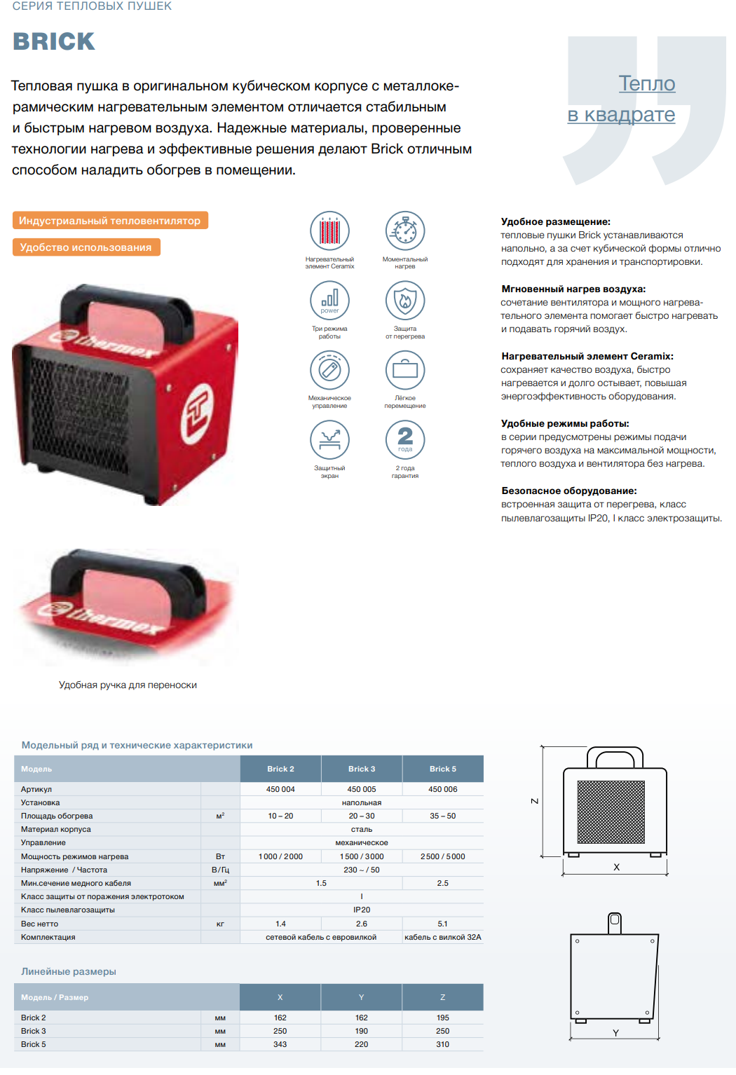 Thermex Brick 5 — это мощный и надежный электрический тепловентилятор, предназначенный для быстрого и эффективного обогрева бытовых и коммерческих помещений. Его ключевым преимуществом является высокая тепловая мощность в 5 кВт, обеспечиваемая современным металлокерамическим нагревательным элементом, который отличается долговечностью и быстрым выходом на рабочий режим. Удобное механическое управление с отдельными регуляторами мощности и термостата позволяет гибко настраивать микроклимат в помещении и экономить электроэнергию. Компактные габариты и прочный стальной корпус делают пушку мобильной и устойчивой. Для обеспечения безопасной эксплуатации прибор оснащен встроенной защитой от перегрева, которая автоматически отключает нагрев в аварийной ситуации.