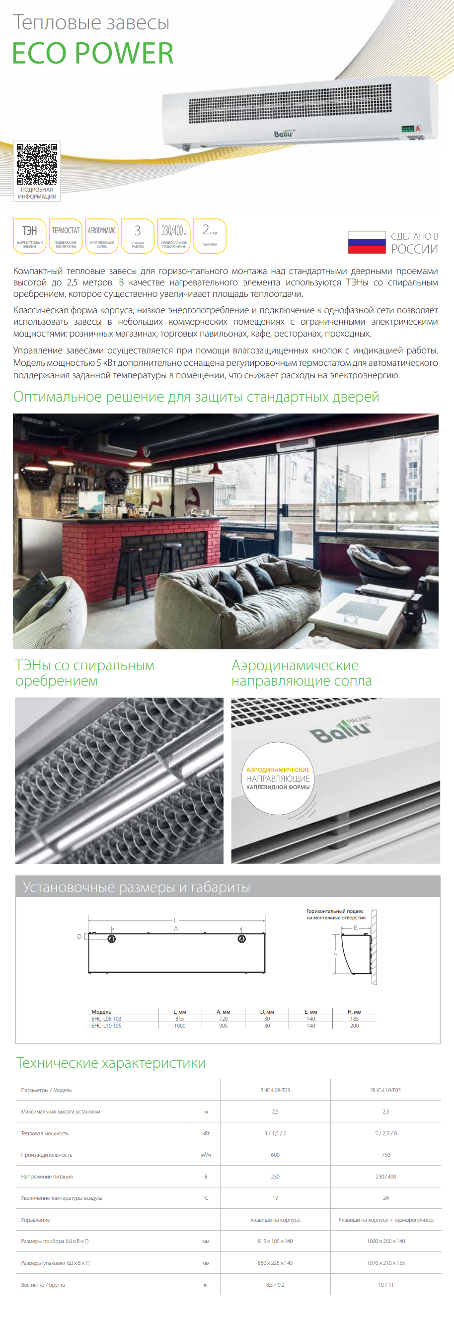 - Номинальная мощность 3,0 кВт — обеспечивает достаточную тепловую производительность для проемов среднего размера.