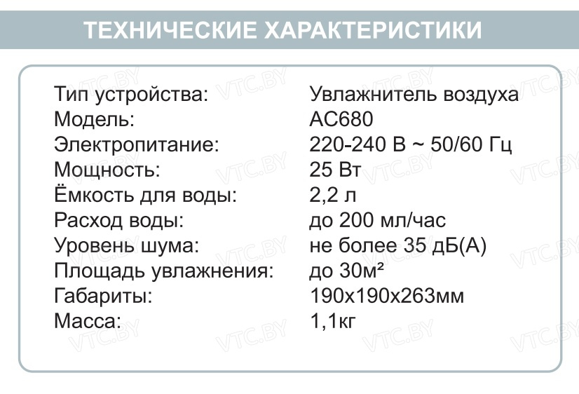 - Компактные габариты: Позволяет разместить увлажнитель на любой подходящей поверхности, не загромождая пространство.
