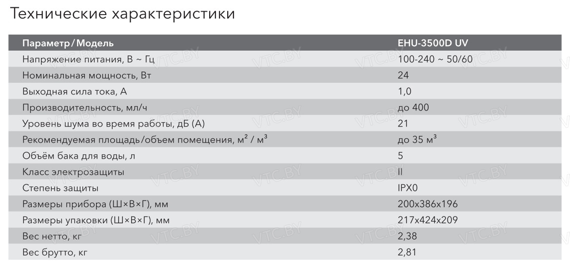 Бренд Electrolux Модель EHU-3500D UV Метод увлажнения Ультразвуковой Верхний залив Да Производительность по увлажнению,мл/ч 400 Объем резервуара,л 5 Обслуживаемая площадь м2 35 Гигрометр Да Гигростат Да Управление Сенсорное Уровень шума,дБ 21 Потребляемая мощность, кВт 0.024 Особенности Таймер, Ароматизация, Защита от известкового налета, Ультрафиолетовая лампа , Индикатор наполнения, Регулировка скорости, Регулировка уровня мощности Гарантия(месяцев) 24 Высота см. 38.6 Ширина см. 20 Глубина см. 19.6 -