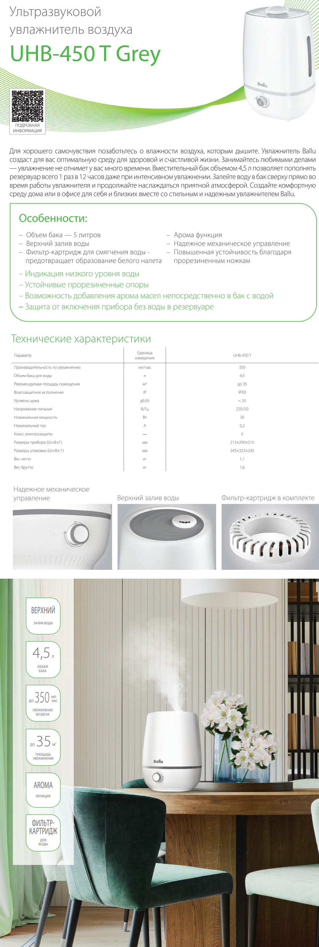 Ballu UHB-450 T Gray — это современный ультразвуковой увлажнитель, создающий не слышимый для человека холодный пар. Он эффективно поддерживает комфортный уровень влажности в помещении площадью до 35 м². Благодаря большому резервуару на 4,5 литра и производительности до 350 мл/ч он способен долго работать без долива. Тихая работа (менее 21 дБ) делает его идеальным для спальни и детской комнаты. Простое механическое управление и функция ароматизации делают его использование удобным и приятным.