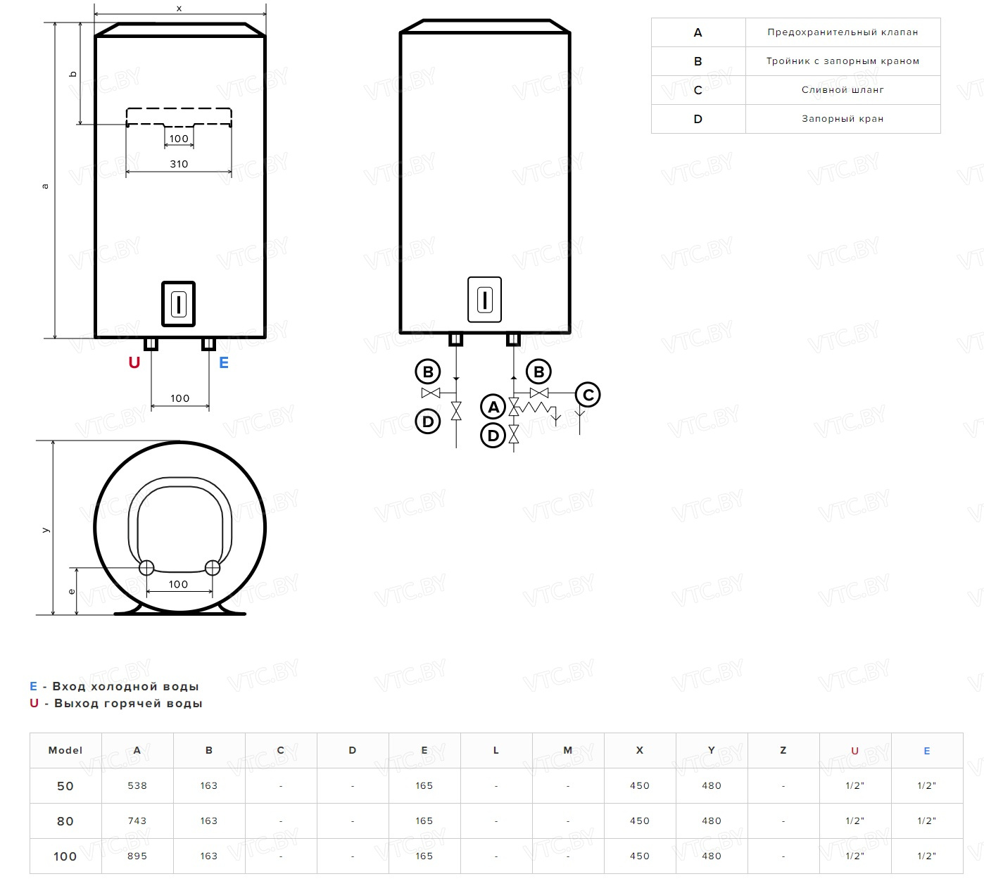 - Встроенный предохранительный клапан — защищает бак от избыточного давления и предотвращает обратный ток воды.
