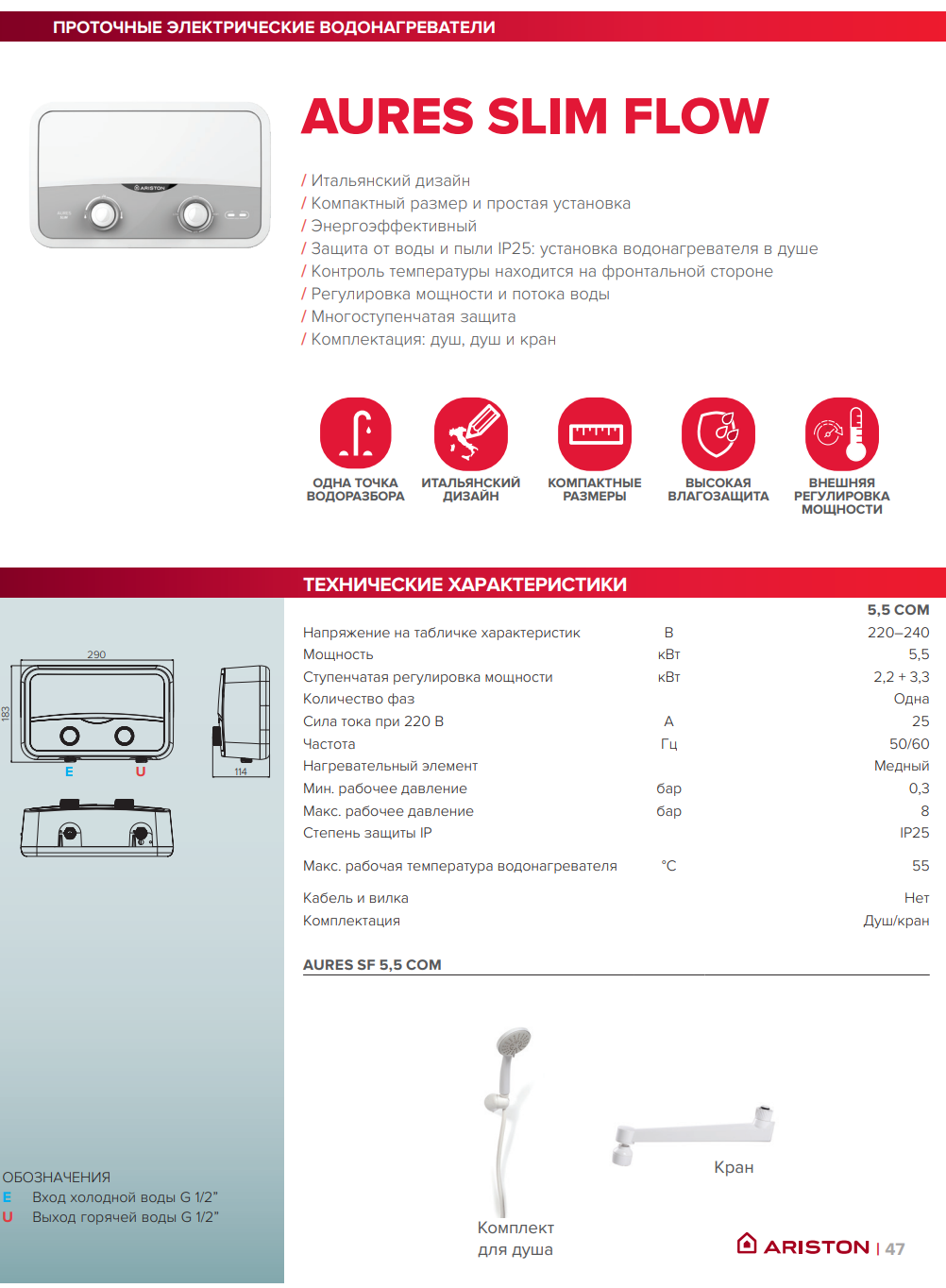 Данный водонагреватель идеально подойдет для небольшой семьи или одного человека, проживающего в квартире или на даче, где требуется обеспечить горячей водой одну точку водоразбора. Он станет незаменимым помощником в период отключения центрального горячего водоснабжения в многоквартирных домах. На даче или в загородном доме Ariston Aures SF 5.5 COM обеспечит комфортный прием душа после рабочего дня. Благодаря защите IP25, его можно устанавливать прямо в душевой кабине, не беспокоясь о безопасности. Это практичное, простое и надежное решение для тех, кто ценит горячую воду сразу после открытия крана.