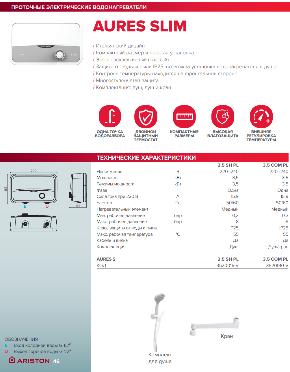 Ariston Aures S 3.5 COM PL станет идеальным решением для дачного дома или летней кухни, где нет централизованного горячего водоснабжения. Он легко обеспечит теплой водой небольшую раковину на кухне для мытья посуды или умывания. Благодаря комплектному душу, прибор можно использовать для комфортного принятия душа в теплый сезон, предварительно переключив его на максимальную мощность. Компактный размер позволяет установить его в ванной комнате малогабаритной квартиры на период отключения горячей воды. Фактически, этот водонагреватель рассчитан на обслуживание одной точки водоразбора (крана или душевой лейки), обеспечивая ее горячей водой по первому требованию.