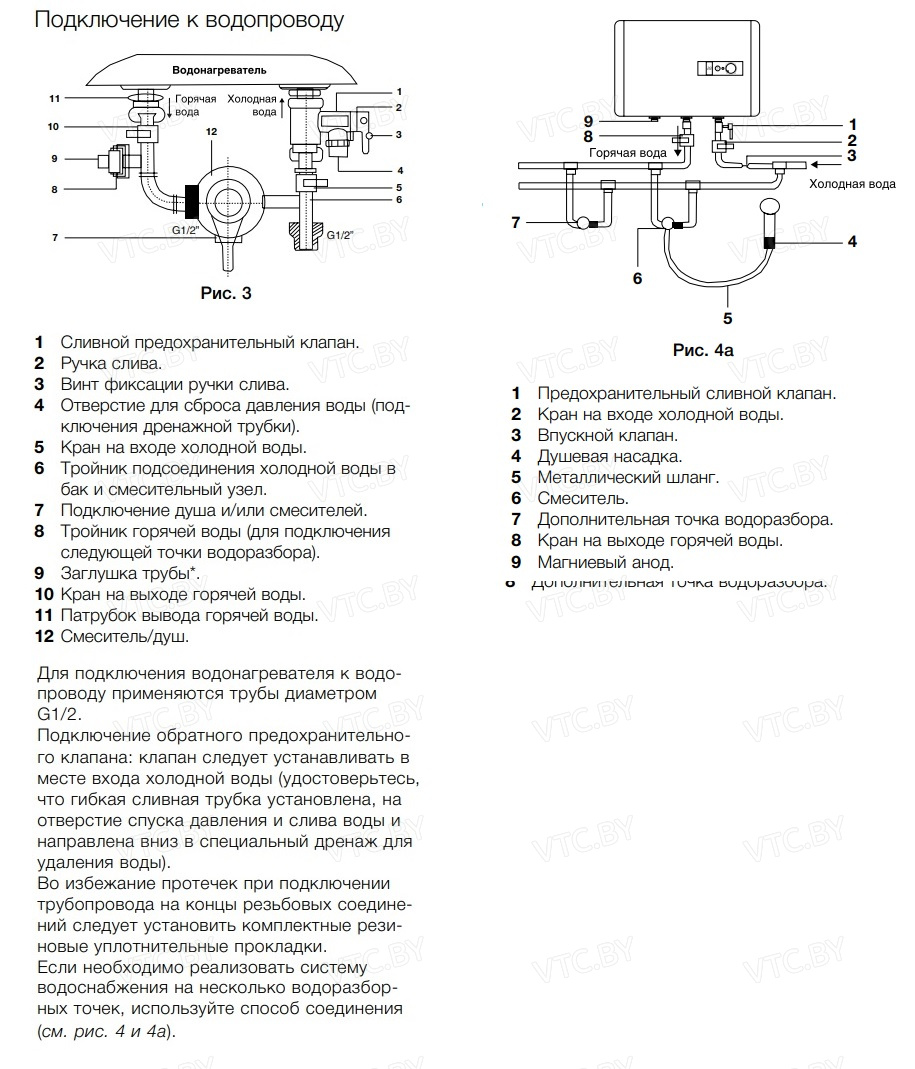 - Предохранительный клапан: Защищает бак от избыточного давления до 6 Бар.