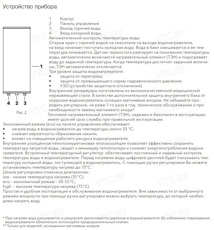 - Режим ECO (55°C): Предотвращает образование накипи, обеззараживает воду и экономит электроэнергию.