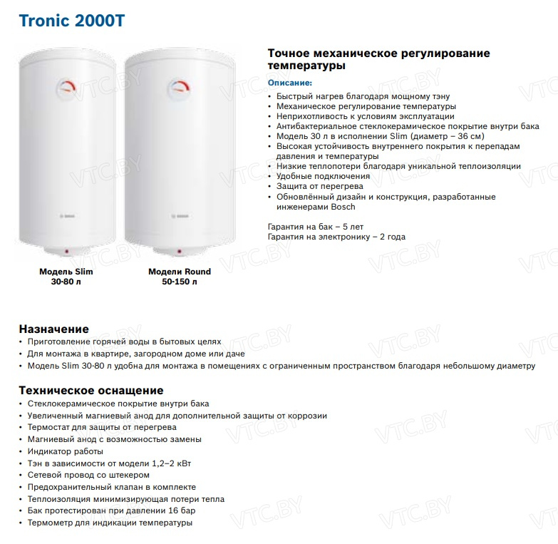 Бренд Bosch Модель TR2000T 80 B 7736504523 Тип Накопительный Форм-фактор Круглый Объем бака,л 80 Способ нагрева электрический Мощность кВт 2.0 Внутреннее покрытие стеклокерамика Управление Механическое Подводка труб Нижняя Расположение вертикальный Способ крепления настенный Особенности Защита от известкового налета, Защита от перегрева, Механический термостат Напряжение 220 В Гарантия(месяцев) 60 Высота см. 78.5 Ширина см. 44 Глубина см. 45.5 - Отзывы