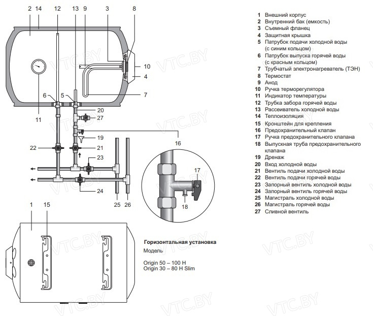 - Магниевый анод — нейтрализует электрохимическую коррозию бака.