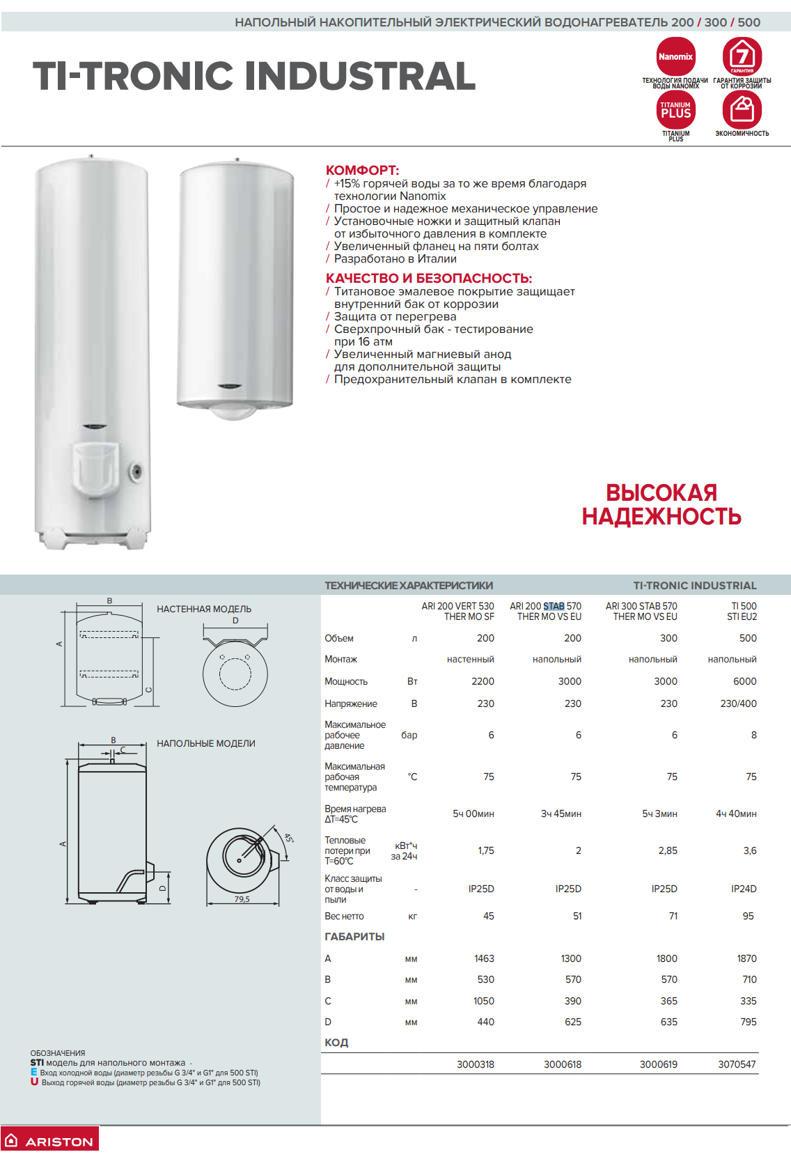 Бренд Ariston Модель ARI 300 STAB 570 THER MO VS EU Тип Накопительный Форм-фактор Круглый Объем бака,л 300 Способ нагрева электрический Мощность кВт 3 Внутреннее покрытие титановая эмаль Управление Механическое Расположение вертикальный Способ крепления напольный Особенности Антибактериальная защита, Влагозащитный корпус, Защита от перегрева, Защита от сухого нагрева (защита от включения без воды ), Механический термостат Напряжение 220 В Гарантия(месяцев) 60 Высота см. 180 Ширина см. 57 Глубина см. 63.5 -