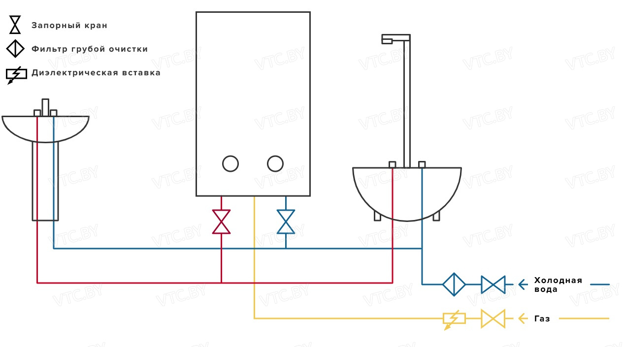 - Встроенный фильтр на входе холодной воды — задерживает механические примеси, защищая теплообменник от засорения.