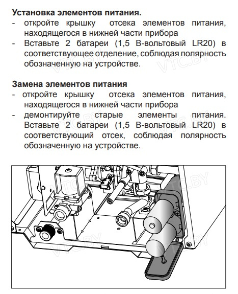 - Питание от 2.х батареек LR20 (1.5V) — обеспечивает автономную работу системы электронного розжига, не требуя подключения к розетке.