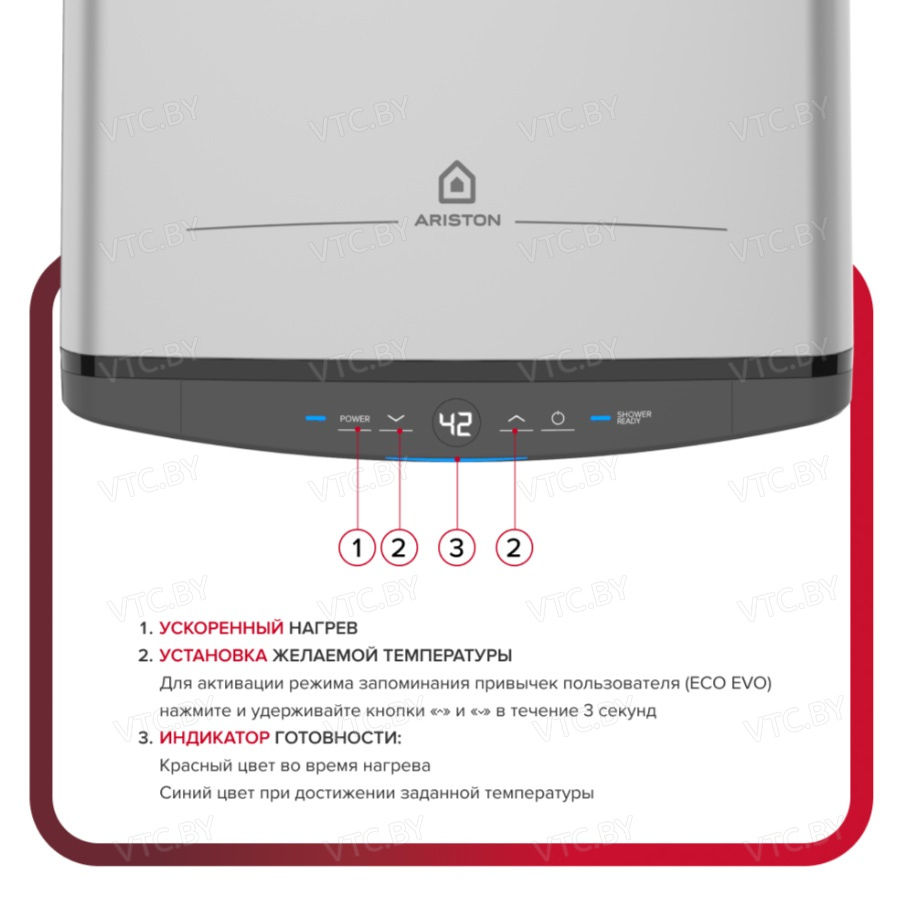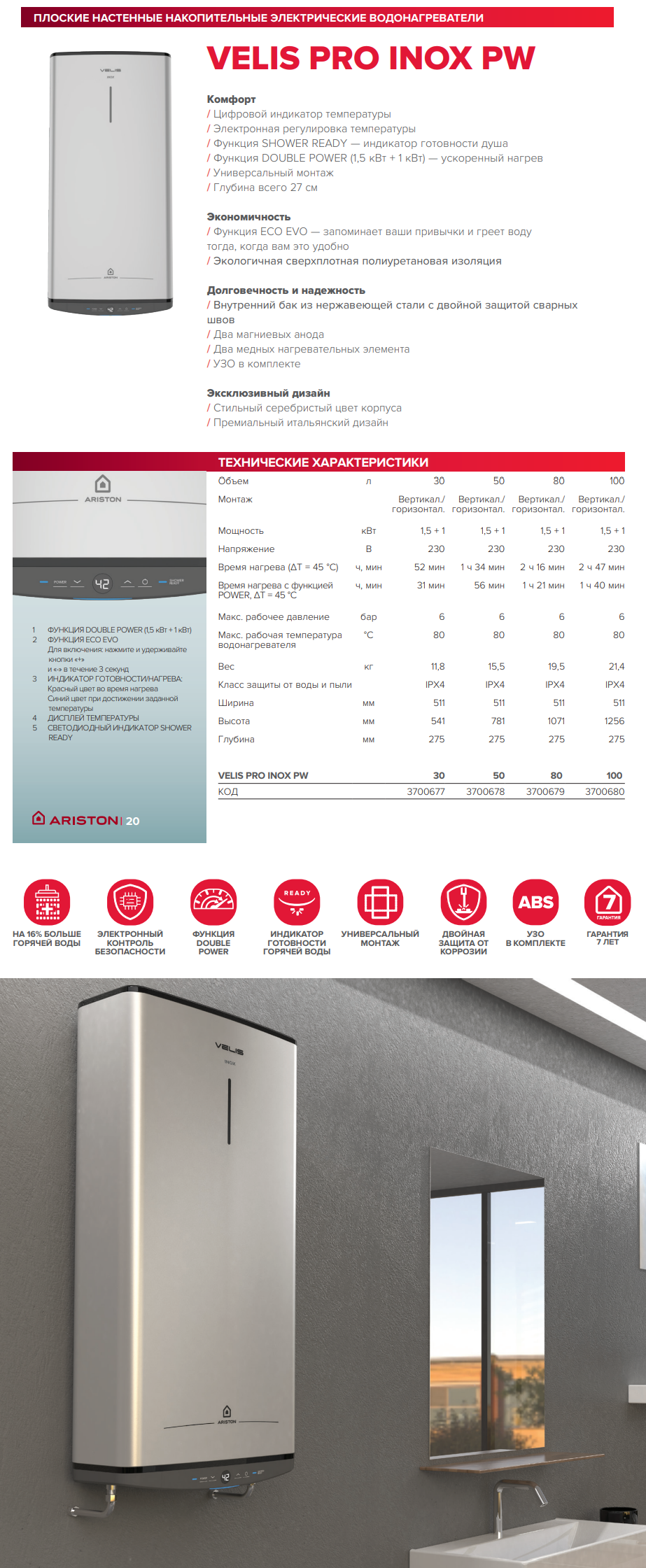 Бренд Ariston Модель ABSE VLS PRO INOX PW 80 Тип Накопительный Форм-фактор Плоский Объем бака,л 80 Способ нагрева электрический Мощность кВт 2.5 Внутреннее покрытие нержавеющая сталь Управление Сенсорное, Электронное Подводка труб Боковая (левая), Нижняя Расположение универсальный Способ крепления настенный Особенности Антибактериальная защита, Влагозащитный корпус, Защита от перегрева, Защита от сухого нагрева (защита от включения без воды ), Регулировка уровня мощности, Режим ЭКО ( ECO ), УЗО (устройство защитного отключения), Электронный термостат Напряжение 220 В Гарантия(месяцев) 60 Высота см. 107.1 Ширина см. 51.1 Глубина см. 27.5 Цвет Серый Ускоренный нагрев (Быстрый нагрев) Да - Отзывы