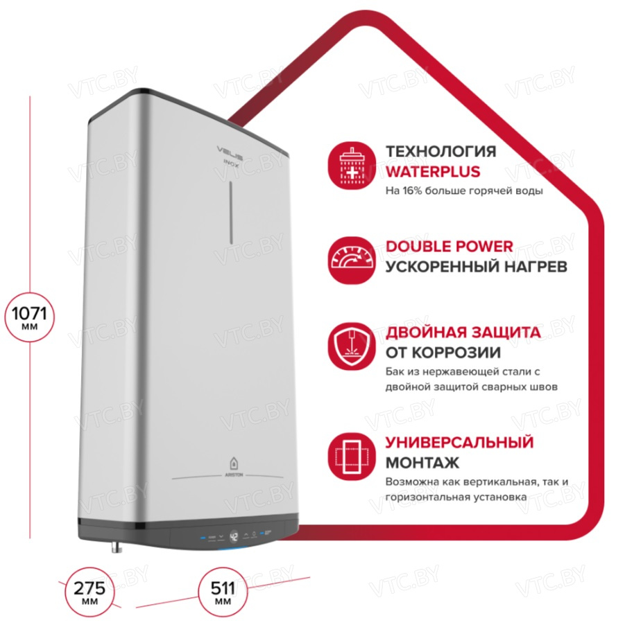 - Технология WaterPlus — увеличивает эффективный выход горячей воды на 16% за счет оптимизации конструкции.