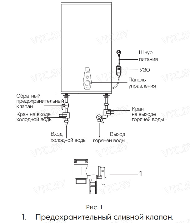 - Предохранительный клапан: Защищает бак от избыточного давления до 6 Бар.
