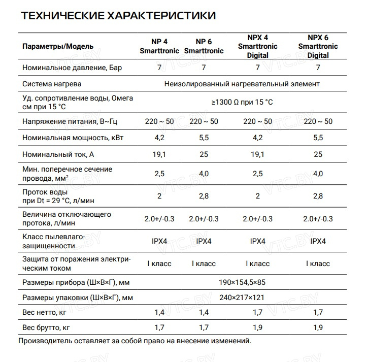 Бренд Royal Thermo Модель NP 6 Smarttronic Тип Проточный системный Способ нагрева электрический Мощность кВт 5.5 Производительность (л/мин) 2.8 л/мин (при Δt=25°C) Управление Механическое Подводка труб Верхняя Расположение вертикальный Способ крепления настенный Особенности Влагозащитный корпус, Защита от перегрева, Защита от сухого нагрева (защита от включения без воды ), Механический термостат, УЗО (устройство защитного отключения) Напряжение 220 В Гарантия(месяцев) 12 Высота см. 15.45 Ширина см. 19 Глубина см. 8.5 Цвет Белый - Отзывы
