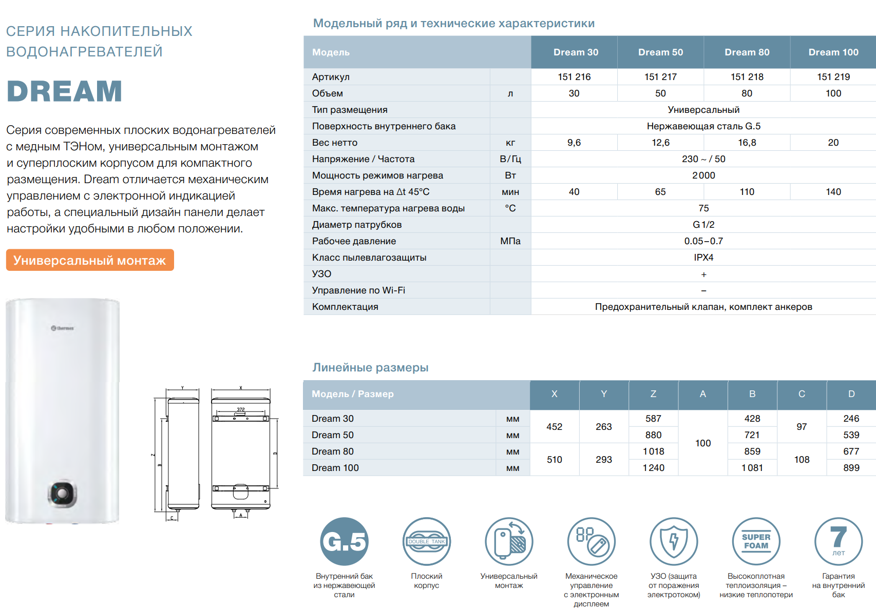 Бренд Thermex Модель Dream 100 Тип Накопительный Форм-фактор Плоский Объем бака,л 100 Способ нагрева электрический Мощность кВт 2.0 Внутреннее покрытие нержавеющая сталь Управление Механическое Подводка труб Боковая (левая), Нижняя Расположение универсальный Способ крепления настенный Особенности Влагозащитный корпус, Защита от перегрева, Механический термостат, Режим ЭКО ( ECO ) Напряжение 220 В Гарантия(месяцев) 84 Высота см. 124 Ширина см. 51.1 Глубина см. 29.3 Цвет Белый - Отзывы