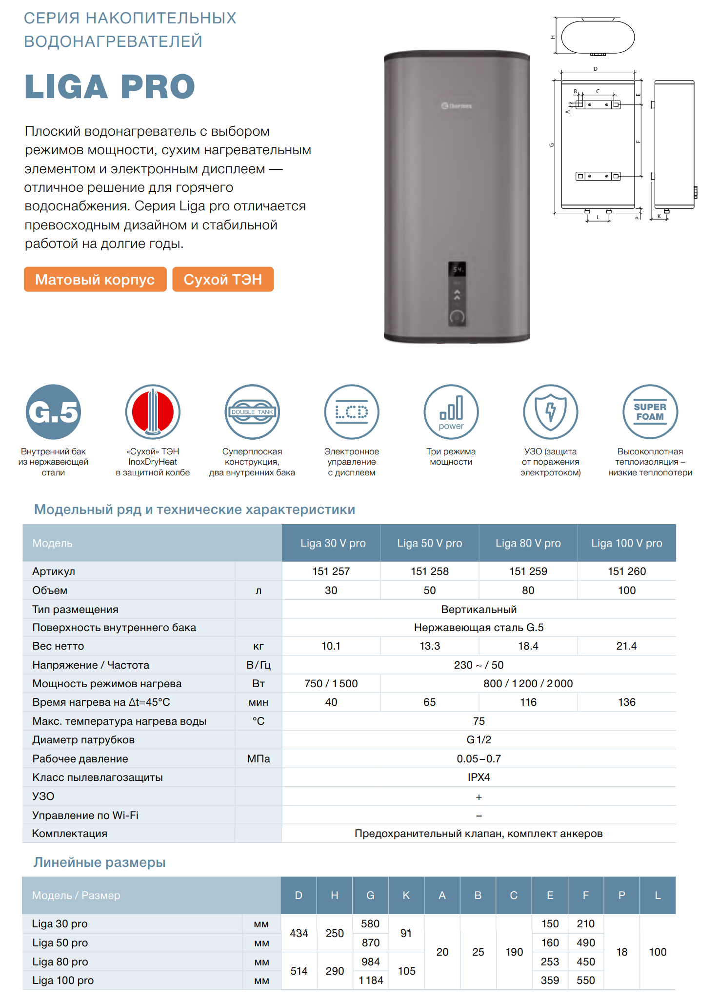 Thermex Liga 100 V (pro) — это флагманский суперплоский накопительный водонагреватель объемом 100 литров с инновационным сухим ТЭНом InoxDryHeat, где два нагревательных элемента заключены в герметичную колбу из нержавеющей стали, полностью исключающую контакт с водой и образование накипи. Внутренний бак из высококачественной нержавеющей стали гарантирует надежную защиту от коррозии и подтвержден увеличенной гарантией 84 месяца (7 лет). Электронное управление с сенсорной кнопкой, крупным дисплеем и точной регулировкой температуры от 30°C до 75°C с шагом 1°C обеспечивает максимальный комфорт и контроль. Модель оснащена тремя ступенями мощности (800/1200/2000 Вт), автоматической защитой от замерзания NO FROST, встроенным УЗО и системой самодиагностики с отображением кодов ошибок.