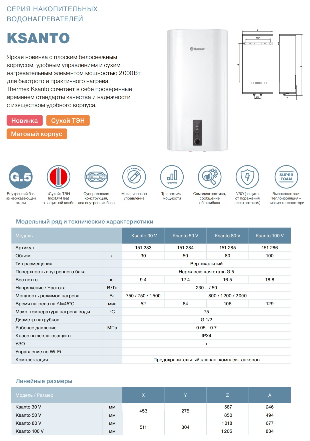 Thermex Ksanto 80 V — это вместительный и эргономичный водонагреватель на 80 литров, разработанный для семей с активным потреблением горячей воды. Суперплоский корпус скрывает в себе два бака из нержавеющей стали, а ключевая технология InoxDryHeat защищает прибор от главного врага — накипи. Модель может похвастаться тремя режимами мощности до 2000 Вт, что позволяет быстро нагревать большие объемы воды или экономить энергию в режиме ожидания. Безопасность обеспечивается встроенным УЗО, системой самодиагностики и прочным корпусом со степенью защиты IPX4.