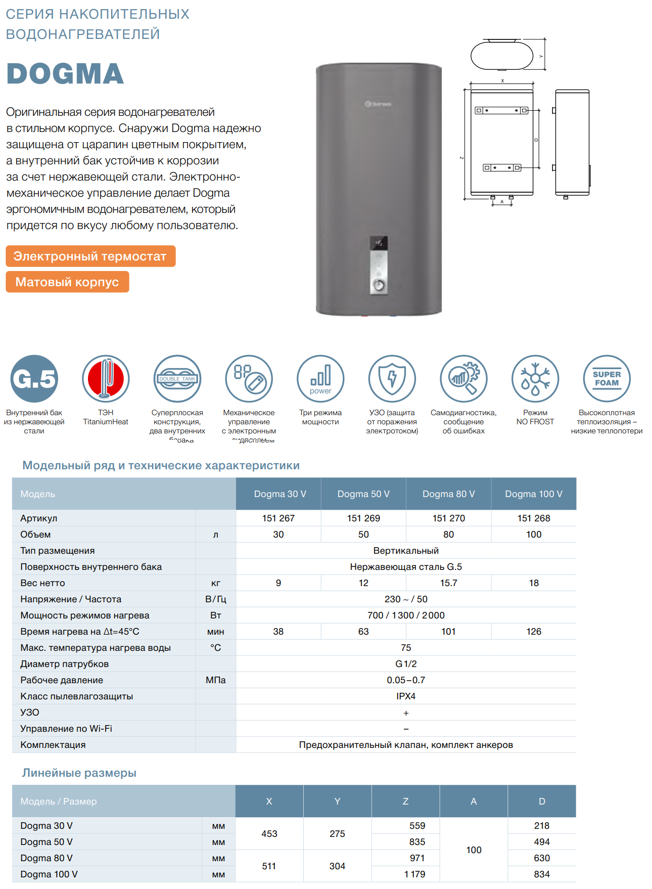 Thermex Dogma 100 V — это флагманская модель линейки, вместительный плоский накопительный водонагреватель объемом 100 литров, оснащенный современным электронно-механическим управлением с крупным информативным дисплеем. Внутренний бак выполнен из высококачественной нержавеющей стали с добавлением титана, что гарантирует исключительную защиту от коррозии и подтверждено увеличенной гарантией 84 месяца (7 лет). Три ступени мощности (700/1300/2000 Вт) позволяют гибко управлять процессом нагрева, а время достижения температуры на 45°C составляет 148 минут при максимальной мощности. Модель оснащена автоматической защитой от замерзания NO FROST, встроенным УЗО, многоуровневой системой самодиагностики и защитой от сухого нагрева, обеспечивая максимальную безопасность и надежность для большой семьи.