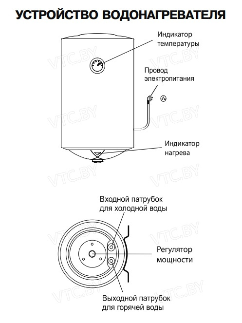 - Индикатор нагрева — светится при работе ТЭНа.