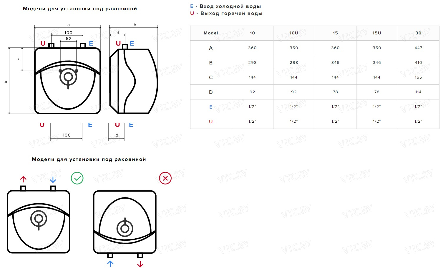 - Увеличенный объем 15 литров: Обеспечивает больший запас горячей воды по сравнению с 10-литровыми моделями при скрытой установке.