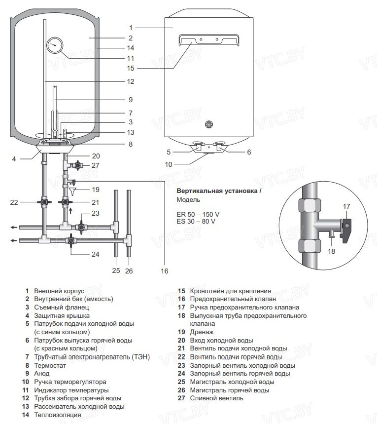 - Предохранительный клапан в комплекте — защита от превышения давления 0,6 МПа.